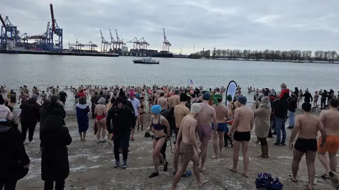 366 Eisbademeisters sind an den Elbstrand gekommen, um gemeinsam für den guten Zweck in die kalte Elbe zu springen.